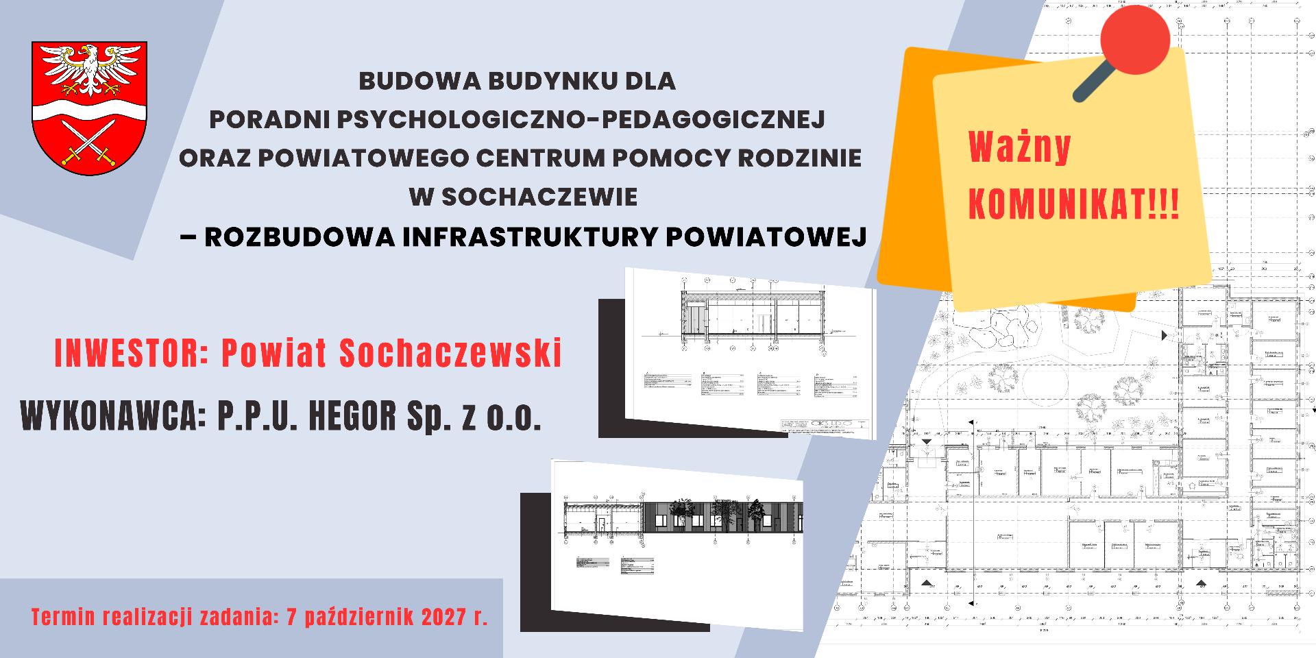 Starostwo Powiatowe w Sochaczewie informuje, że w związku z realizacją przez powiat sochaczewski inwestycji pn.: „Budowa budynku dla Poradni Psychologiczno-Pedagogicznej oraz Powiatowego Centrum Pomocy Rodzinie w Sochaczewie – rozbudowa infrastruktury powiatowej”, na terenie utwardzonym z miejscami postojowymi dla pojazdów, zlokalizowanym przy budynku Starostwa Powiatowego w Sochaczewie (ul. marsz. J. Piłsudskiego 65), wystąpią czasowe utrudnienia w dostępie do części placu.
